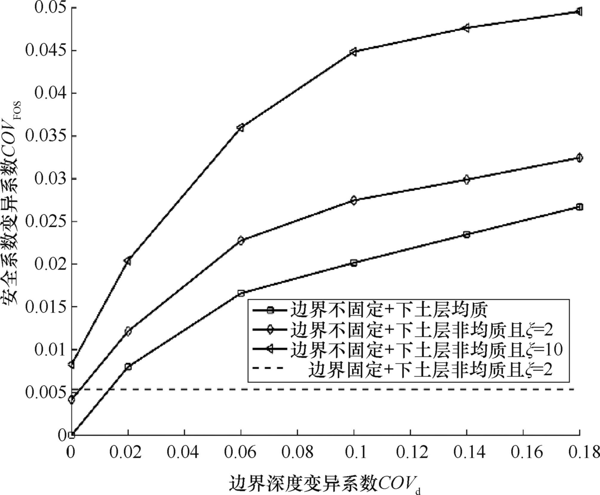 如图7所示,就FOS变异系数来看,当COV 取0(即边界固定),COV 处于较低水平,其中均质土对应的CO 。当COV 逐渐增大时,三种条件下COV 均呈上升趋势,但 “非均质且各向异性度ξ=10”对应的曲线上升趋势 当COV 取0.18时,该曲线对应的COV 达到了0.05,是COV 取0时的5倍以上。这说明边界深度变异系数和土 空间变异性对FOS不确定性都有明显影响,其耦合影响更为显著。