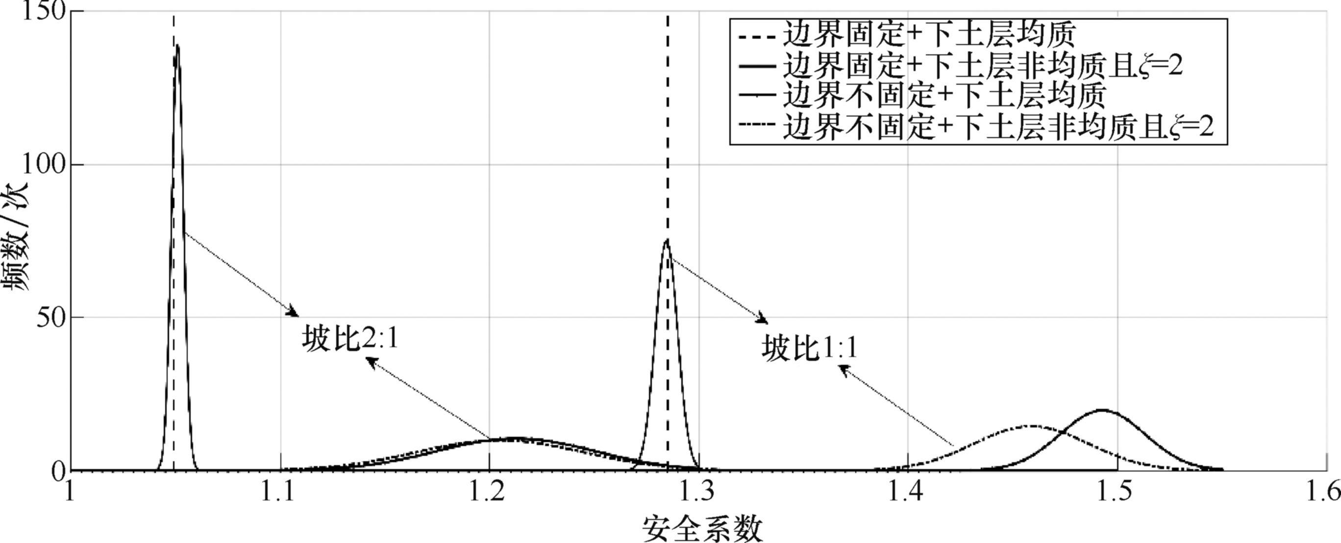 从定量分析来看,考虑边界固定/不固定、下土层均质/非均质、坡比1∶1/2∶1 组成8种情况对比。如图5所 坡比如何,边界固定时安全系数均值大幅提高。原因在于通过坡脚位置的滑坡通常对应较低的安全系数,当坡脚 积了大量抗剪强度较高的土体时,安全系数均值提高。但由于引入了边界不确定性,安全系数的变异系数也大大 与文献[34]的结论相一致。