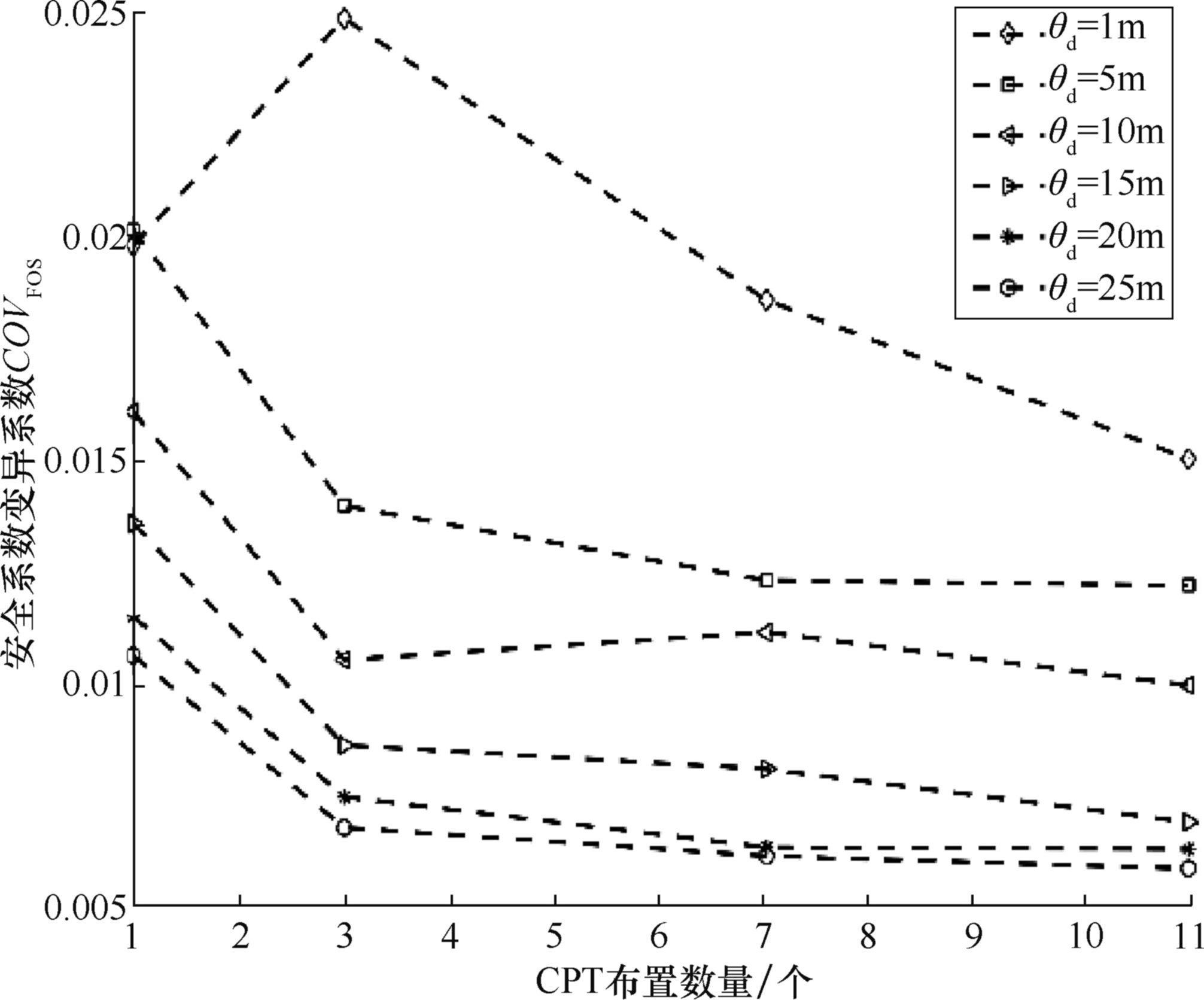 以上综合表明:当边界相关长度较小时,密集的CPT对约束边界深度,降低边坡稳定性分析的不确定性具有 用;而当边界相关长度较大(如本算例中的10 m)时,少量的CPT即可满足边坡计算的设计要求,即使布置更多的 效果也基本类似。在实际工程运用中,如能利用一定的方法获取边坡的边界相关长度的参考信息,就能在满足安 的前提下,布置合理密度的CPT,节省不必要的测试费用。