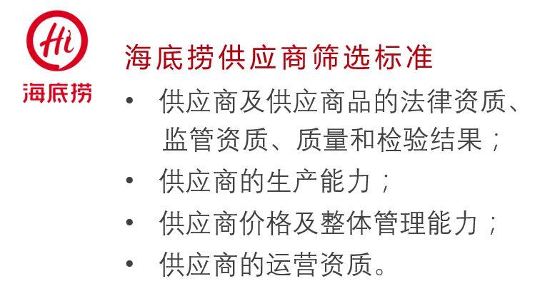 对于某些特定食材配料,海底捞甚至会要求供应商从特定货源采购,并直接在货源进行检验;