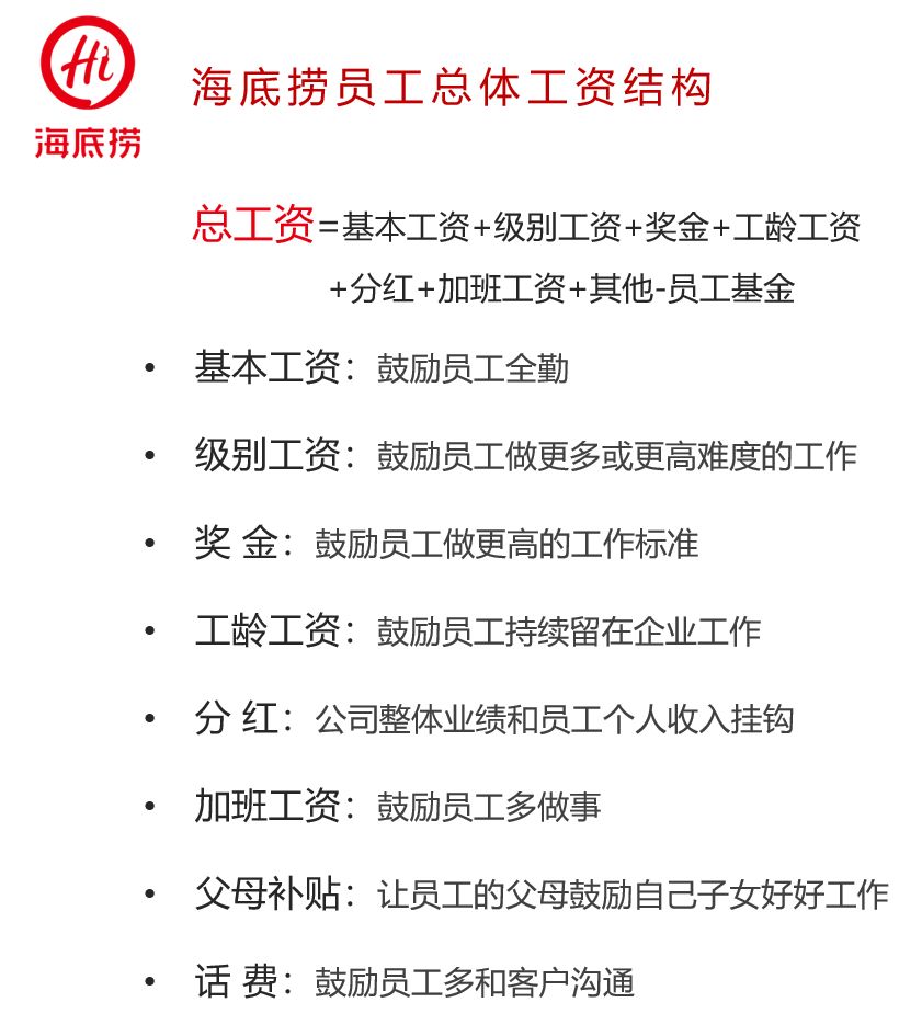 多劳多得不只停留在思维上,或者“底薪+提成”上,还要看企业让员工劳什么、得什么。海底捞在员工工资结构里,设计了至少8块不同的细分内容,激励员工的不同行为。截至2017年底,排除董事薪酬,海底捞员工平均年薪约为6万元。