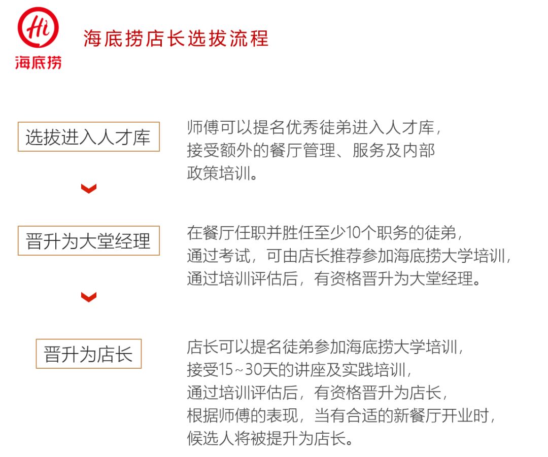 海底捞餐厅设立了一套师徒计划,用于培养适合成为大堂经理及店长的高素质员工。