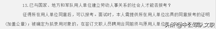 在面试时,本人需提供所在用人单位出具的同意报考的证明(加盖公章);被确定为拟录用对象的,在签订文职人员聘用合同前须与原用人单位解除劳动人事关系。