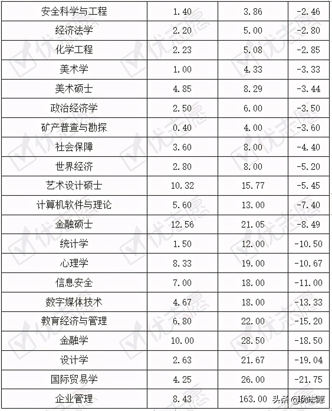 表1为福大2019-2020年报录比波动大于等于2的专业,报录比增加说明该专业2020年的报考难度提升,报录比减小说明该专业2020年的报考难度降低。