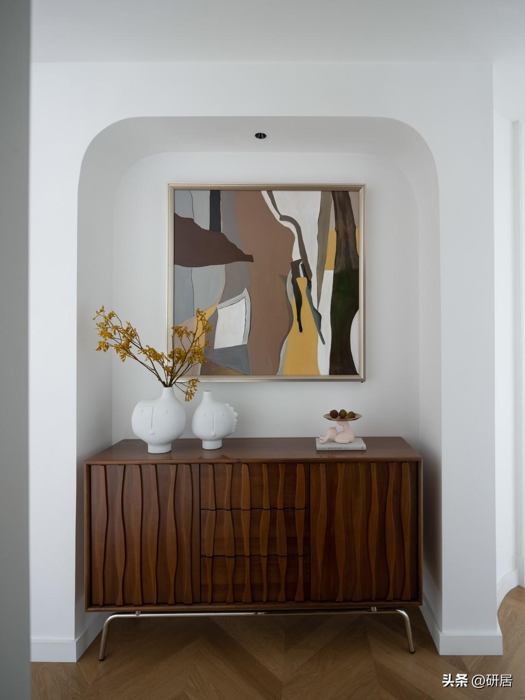 因为是一梯一户格局,可以把鞋柜放在电梯间,所以进门就打造出一个纯欣赏的入户端景。这个第一景把现代美式特点完全给展现出来,没有太多欧式风格的拘束感,也没有过多的装饰,在白墙上挂一幅装饰画,再摆放一张端景柜,利用软装凸显出一种崇尚自然的效果。
