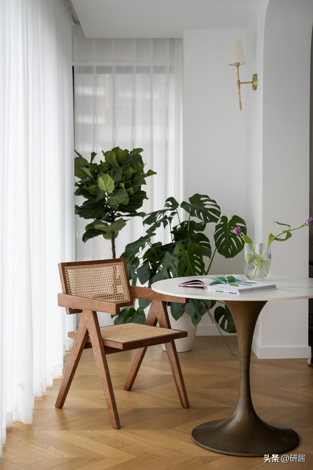 不论哪种风格的装修,那种仿佛住在阳光里的空间是最令人向往的。真的要来安利一下她布置的阳台,大大的落地窗引入最充足的光线,还有圆桌、有昌迪加尔藤椅,还有大件的绿色植物,把它们放在一起,营造出来的氛围感真叫人羡慕,风吹起梦幻白纱的瞬间,的确非常治愈。