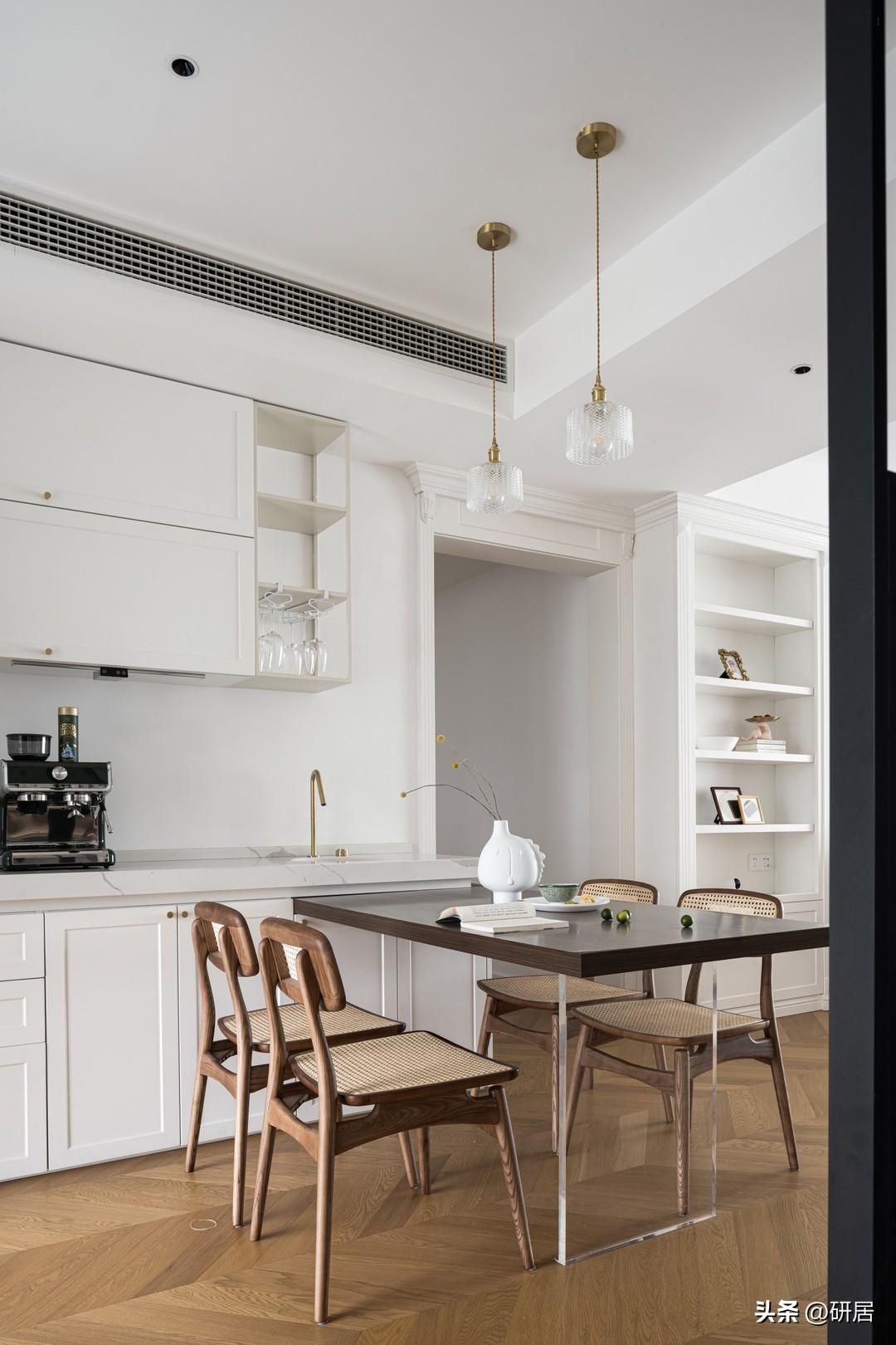镜头转至餐厅,满眼的优雅与明朗,这里同样地用了大量的白色,整体空间色彩给人温和柔美的感觉,现代美式喜欢用混搭元素去营造出舒适雅致的环境,所以你见到的餐厅里不仅有美式、北欧元素,还有现代素材,比如说我最喜欢的亚克力的桌腿设计,给空间带来一种悬浮感,同时也让空间更显加通透。