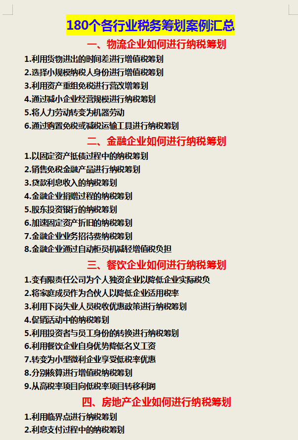 180个各行业税务筹划案例汇总(包含物流、金融、餐饮、房地产、出版、商务服务企业;反避税、新企业所得税、个人所得税、增值税、消费税、企业营改增以及其他税种制度下的税务筹划)