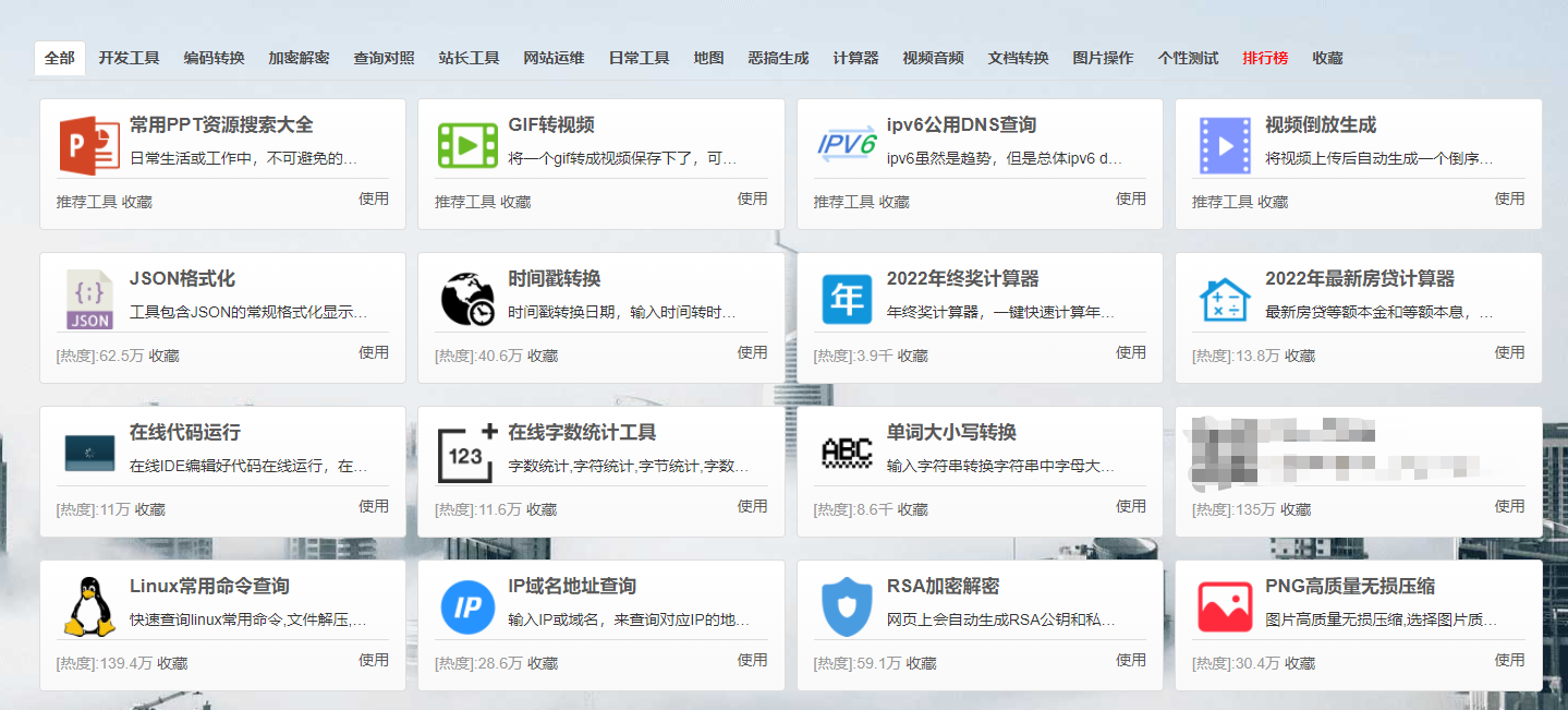 这里涵盖了打工一族所需要的90%以上工具,从开发工具、编码转换、网站运维,再到计算器、图片操作、文档转换,可谓一应俱全。