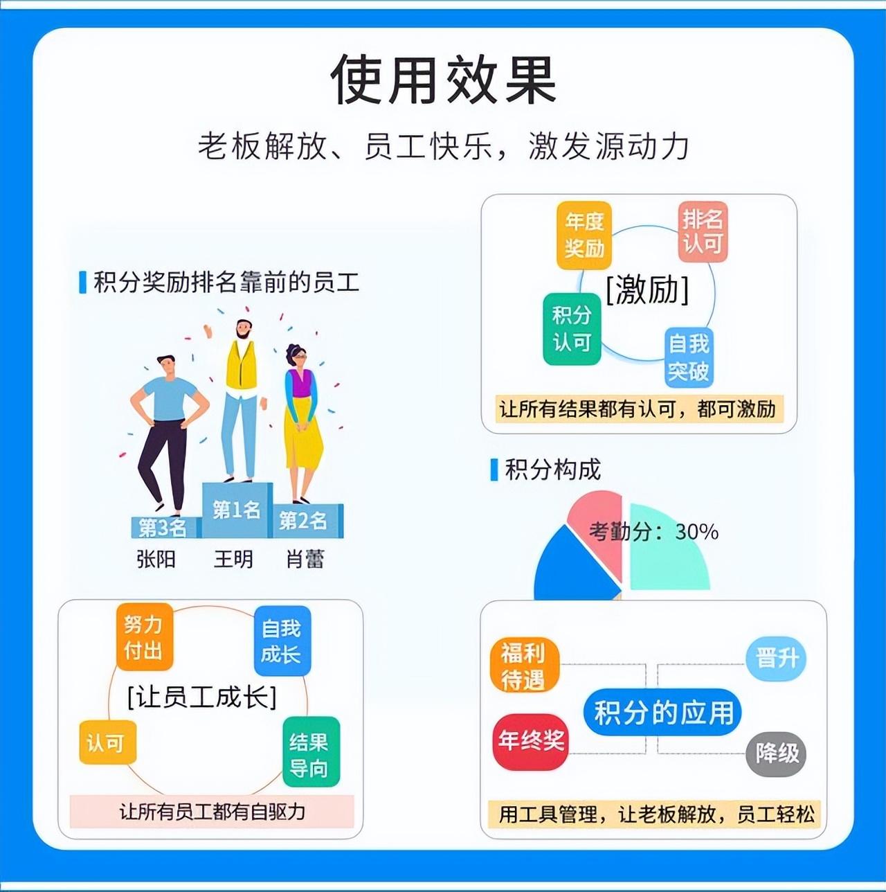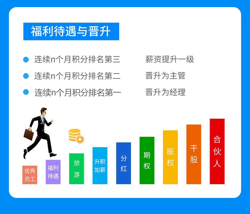 而积分又是跟员工的各种福利、待遇、升职、加薪、评优、分红、股权等好处进行挂钩的,只要员工的积分达到了相应的条件,就能够享受到相应的好处。