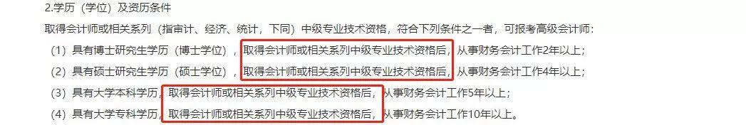 2、硕士学历工作年限具备硕士研究生学历或硕士学位,大学本科学历或学士学位,第二学士学位或研究生班毕业,取得会计师职称后,从事与会计师职责相关工作满5年。(之前硕士学历为4年)