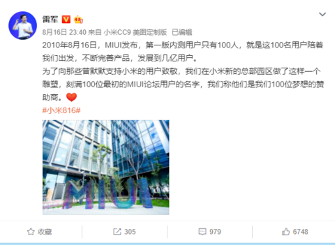 2019年,小米又在新的总部园区做了一个MIUI雕塑,上面刻满了100位最初的MIUI论坛用户的名字。这对用户来说是一种莫大的肯定,这种肯定让用户完成了从普通用户到发烧友、超级粉丝的转变,成为小米的死忠粉。