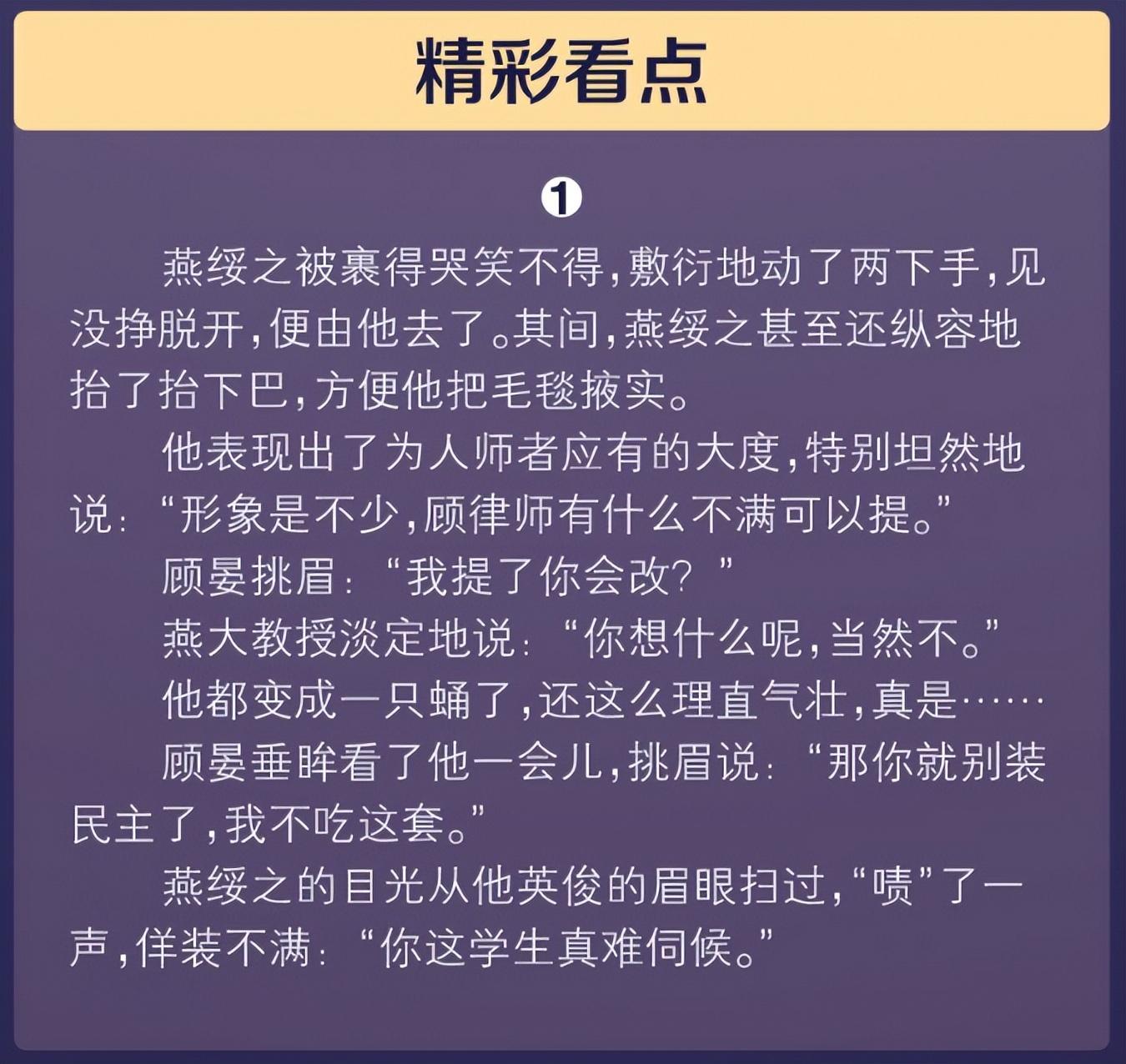 这一次不再是侧身而过,而是隔着大律师办公桌面面相对——从不收实习生的顾晏,因为偶然的机缘,破天荒地收了燕绥之这个学生!