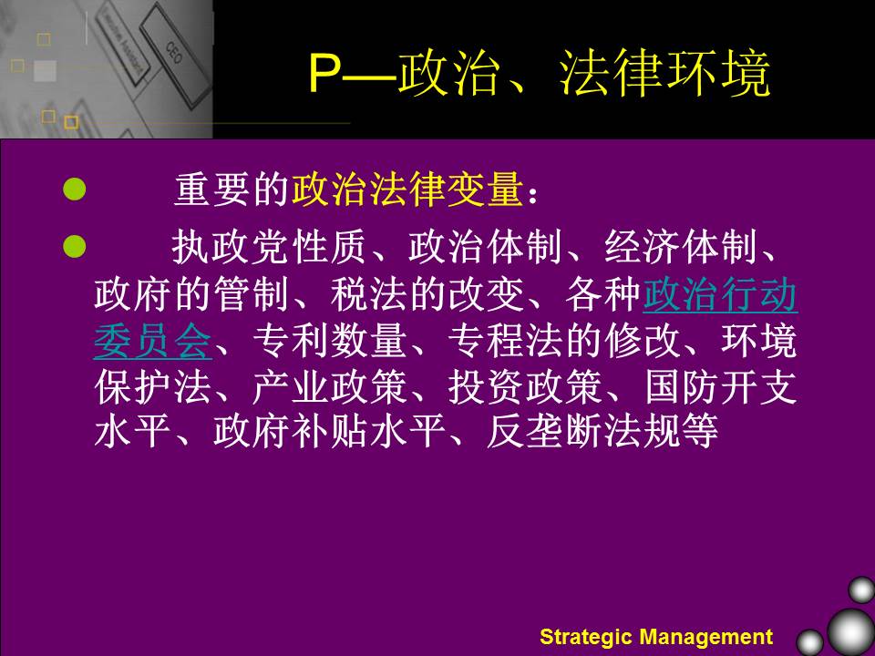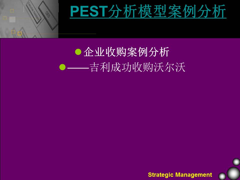 该套PPT课件主要介绍了一、PEST概念描述,二、PEST分析的变形,三、使用时机,四、执行步骤,五、PEST分析模型案例分析—吉利成功收购沃尔沃。无论是拿来自己学习还是与别人分享,都是不错的。