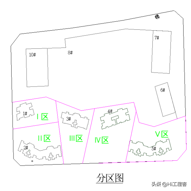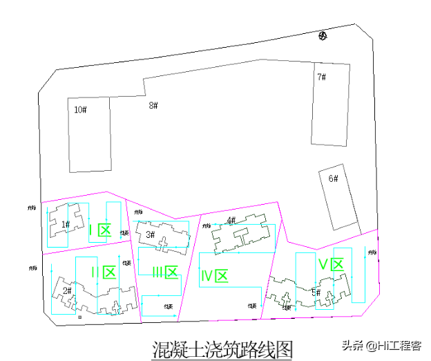 Ⅰ、Ⅱ区流水施工,Ⅳ、Ⅴ#区流水施工,最后进行Ⅲ区。
