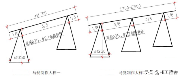 (6)绑扎完下层钢筋后,摆放钢筋马凳,底部与下层筋点焊固定,根据0.6m厚基础钢筋布置情况分析,0.6m厚基础底板采用A形钢筋马凳作为钢筋支架。马凳采用Φ22、Φ25钢筋制作。马凳长度1.5m~2.5m;高度为:板厚-上下保护层-下铁下层钢筋直径-上铁两层钢筋直径。例如600厚板,上下保护层分别是20㎜和50㎜,下铁下层筋直径25,上铁两层筋直径44(取45),马蹬高度为:600―(20+50)―25―45=460㎜,如考虑钢筋壁肋局部重叠,马凳高度460㎜可取450㎜。现场马凳放置间距不大于2000。马凳制作大样如图。