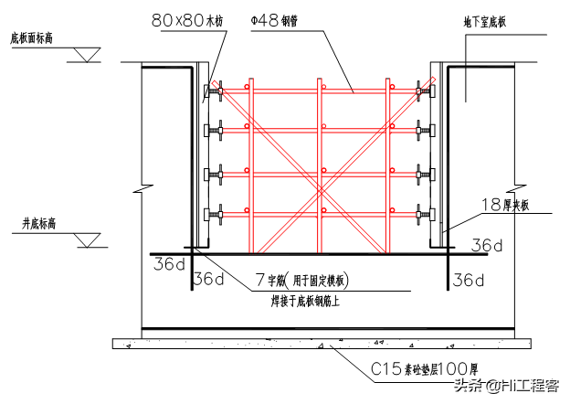 外墙水平施工缝留在距底板面150处,设一条3×400钢板止水带,支模方法: