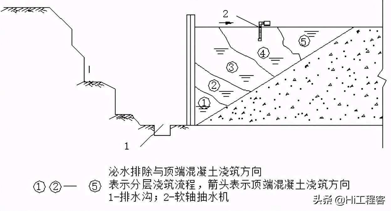 分层浇捣措施:为了保证每一处的混凝土在初凝前就被上一层新的混凝土覆盖,采用斜面分段分层踏步式浇捣方法,按1:5坡度自然流淌,分层厚度不大于500mm,分层浇捣使新混凝土沿斜坡流一次到顶,使混凝土充分散热,从而减少混凝土的热量,且混凝土振捣后产生的泌水沿浇灌三顺斜坡排走,保证混凝土的质量。