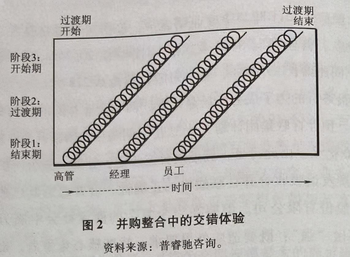 在整合期,企业要完成组织架构整合、市场营销整合、流程优化、安置人员、协调利益、实施文化整合等一系列步骤,人在长达180天甚至更长时间里面对一系列不确定性事件,变得谨慎行事、聚焦个人问题。并购整合中企业人员的交错体验如图2所示。