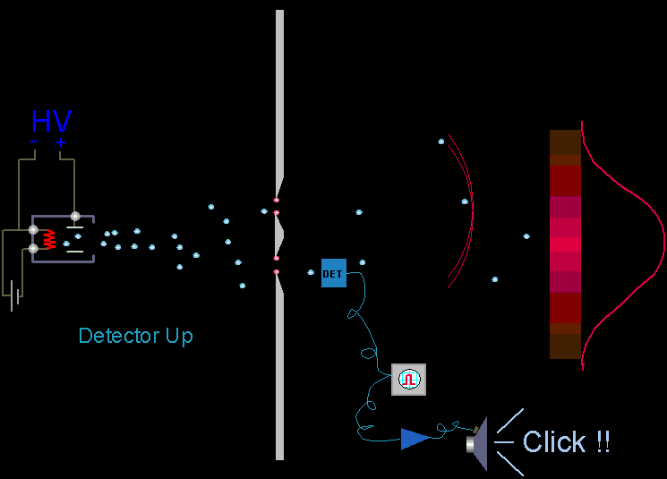 看到这里聪明的你一定已经发现猫腻了,这特么就是让光只能从其中一条缝经过啊?这不就相当于过单缝了吗?前面我们说过光子是跟自己干涉的,现在光子只能穿过其中一条缝,还跟谁干涉去?……