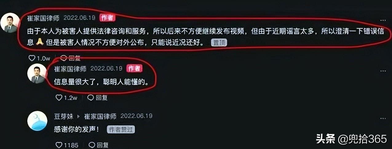 崔家国律师表示:由于本人为被害人提供法律咨询和服务,所以后来不方便继续发布视频,但由于近期谣言太多,所以澄清一下错误信息,但是被害人情况不方便对外公布,只能说近况还好。
