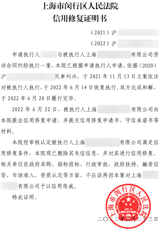 中小微企业是市场的主体,是保就业的主力军。他们的生存与国民经济和社会发展息息相关。在本轮疫情的冲击下,市场主体特别是中小微企业面临巨大压力,生产经营遭遇诸多困难。为帮助企业尽快恢复正常有序运转,上海闵行法院依据法律规定,出具《信用修复证明书》,鼓励当事人主动履行义务,承担责任,消除不良影响,重塑良好信用。此举既保障了当事人的合法权益,也为小微企业复工复产提供有力支持。利用信用评价机制,让守信者“降成本、减压力”,让失信者“付代价、增压力”,探索建立当事人信用修复机制,为进一步优化营商环境提供司法助力。