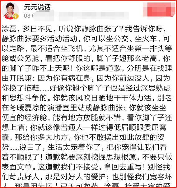 最义愤填膺的,莫过于著名央视主持人刘元元,在她的那篇长微博中,文才并茂地批判涂磊就是个“伪君子,真小人”。
