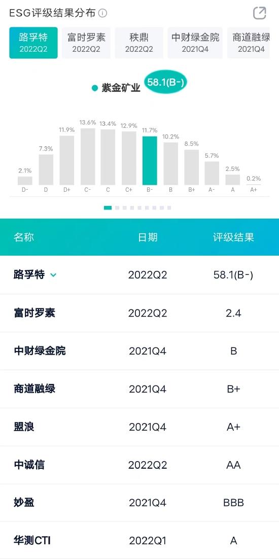 目前,紫金矿业在全球范围内ESG评级表现良好。在新浪财经ESG评级中心查询,紫金矿业在国内多家评级机构的表现优秀,盟浪A+,中诚信AA,华测A。国外机构中,路孚特58.1(B-),富时罗素2.4,也均为行业平均水平。收购ST龙净无疑将增强紫金矿业的低碳转型能力,提升气候变化风险的应对能力。