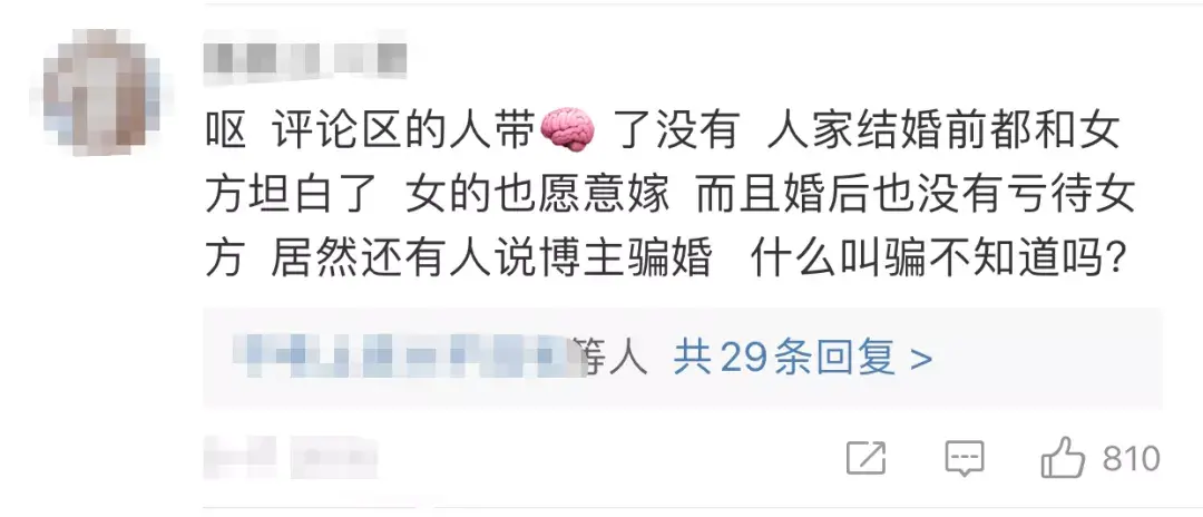 东窗事发后,杨某被指责骗婚,他表示很不解。自从陈某嫁过来之后,家里人对她都很好,每个月自己还帮女方还花呗,物质上更未苛待过一丝一毫。而且自己已经尽到婚前告知义务,根本不算骗婚。