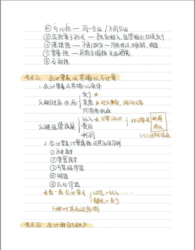 考核重点→六大会计要素、五大计量属性、会计静态动态恒等式