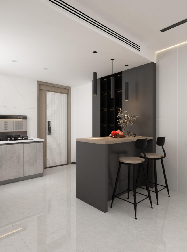 客厅与餐厅之间,设置吧台,形成隔而不断的效果,打造品享美食与情感互动的幸福场景。大理石瓷砖的台面,让空间更宽敞透亮,提升整体的现代感。