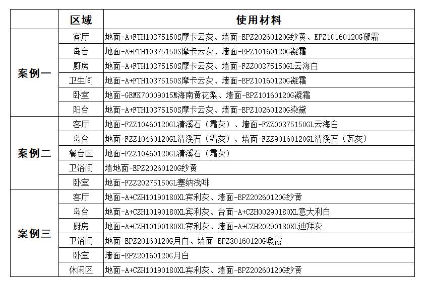 三个案例介绍完毕啦,各个区域使用的瓷砖材料都整理出来了,各位宝子可以参考: