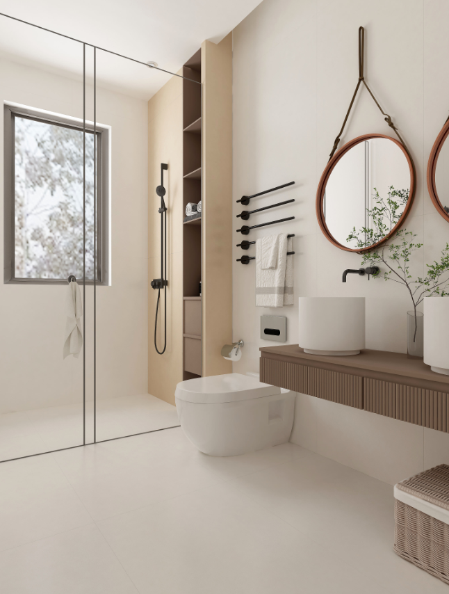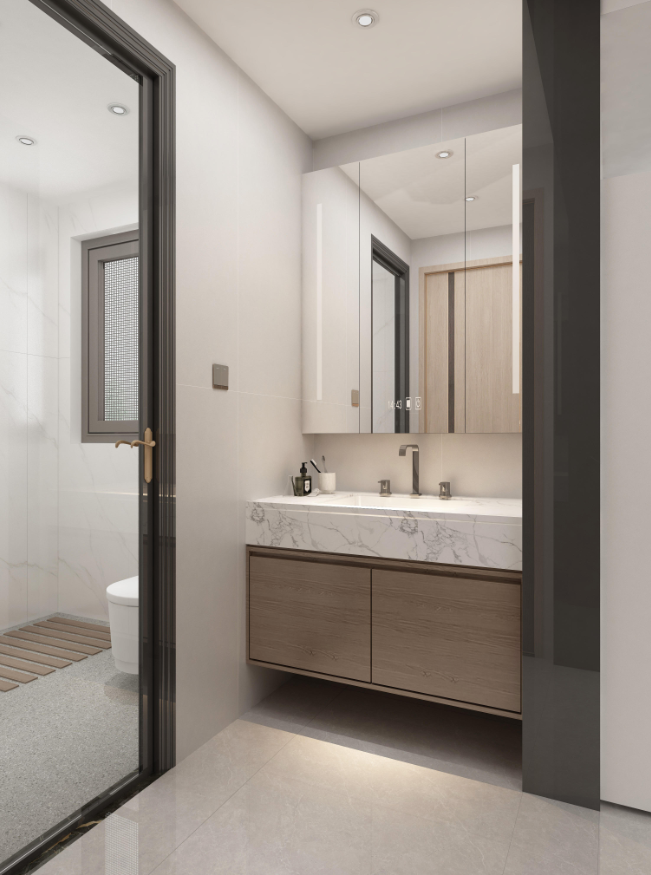 卫浴间整体从简,瓷砖墙地一体化的设计,统一和谐,呈现着祥和静谧的氛围。采用玻璃隔断做干湿分离,区分功能区域的同时有效扩大空间,带来简约大方的视觉体验。