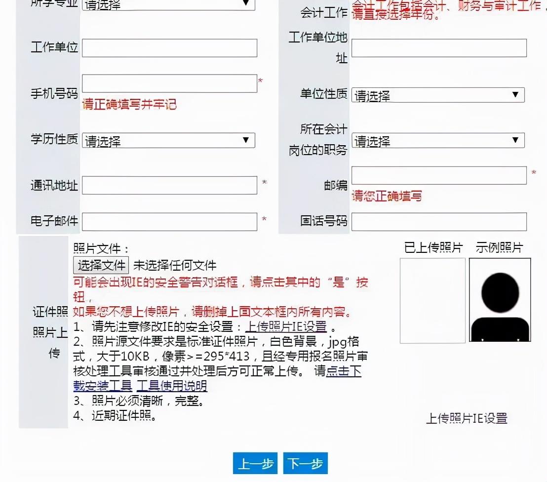 填写报名信息并上传照片。非首次报名考生请输入上次报考的证件类型、证件号码。首次报名的学生请注意:证件注册后不能更改。