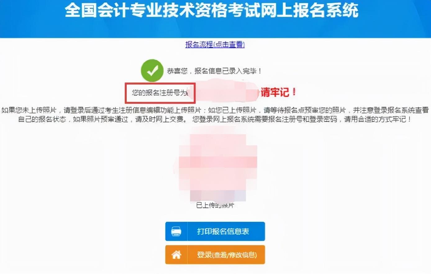 初级会计报名信息输入完毕后,系统会自动生成一个报名注册号,考生应牢记“报名注册号”和“登录密码”,网上缴费前可凭“报名注册号”和“登录密码”登录报名网站自行修改报名信息。