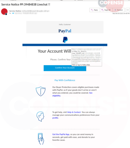 邮件的主题行表明该电子邮件正在尝试发起实时聊天,以讨论与目标PayPal帐户相关的服务通知。攻击者并未掩盖发件人地址,研究人员将其识别为与合法PayPal电子邮件无关的地址。电子邮件正文包含一个“帮助和联系”链接,以及一个具有讽刺意味的“学习识别网络钓鱼”链接,两者都指向真实的PayPal链接。将鼠标悬停在标有“确认您的帐户”的按钮上时,它不会指向 PayPal URL,而是指向 direct[.]lc[.]chat 中的 URL。如果用户熟悉 PayPal 就会发现他们被带到了 PayPal 之外的域,而合法的 PayPal 实时聊天是托管在 PayPal 域内的。电子邮件正文如下: