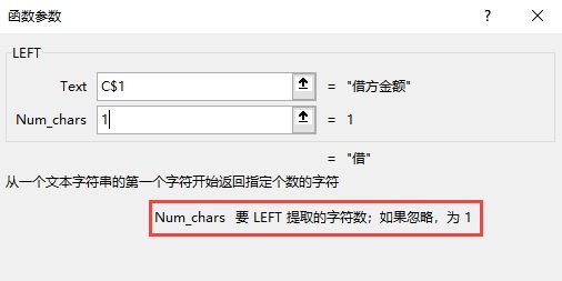LEFT函数就是从左边提取字符,借方金额和贷方金额,现在提取第1个字符来比较。