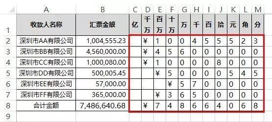 再拓展一个案例:将金额分开显示在每个单元格,这个也是会计常用的。