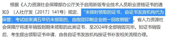 根据《人力资源社会保障部办公厅关于启用新版专业技术人员职业资格证书的通知》(人社厅发〔2017〕141号)规定,“未按时领取的证书,由证书发放机构代为保管;考试结束满五年仍未领取的,由指定印制企业统一回收销毁”。