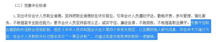 完善守信联合激励和失信联合惩戒机制,违反《中华人民共和国会计法》第四十条有关规定,以及剽窃他人研究成果,存在学术不端行为的,在会计人员职称评价过程中实行“一票否决制”。对通过弄虚作假取得的职称一律撤销。