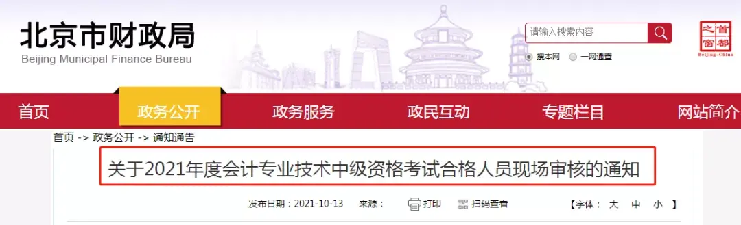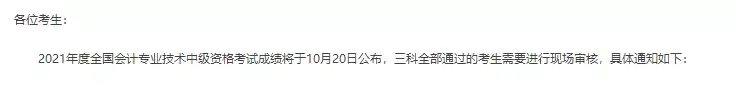 北京财政局发布《关于2021年度会计专业技术中级资格考试合格人员现场审核的通知》,明确表示:2021年度全国会计专业技术中级资格考试成绩将于10月20日公布!