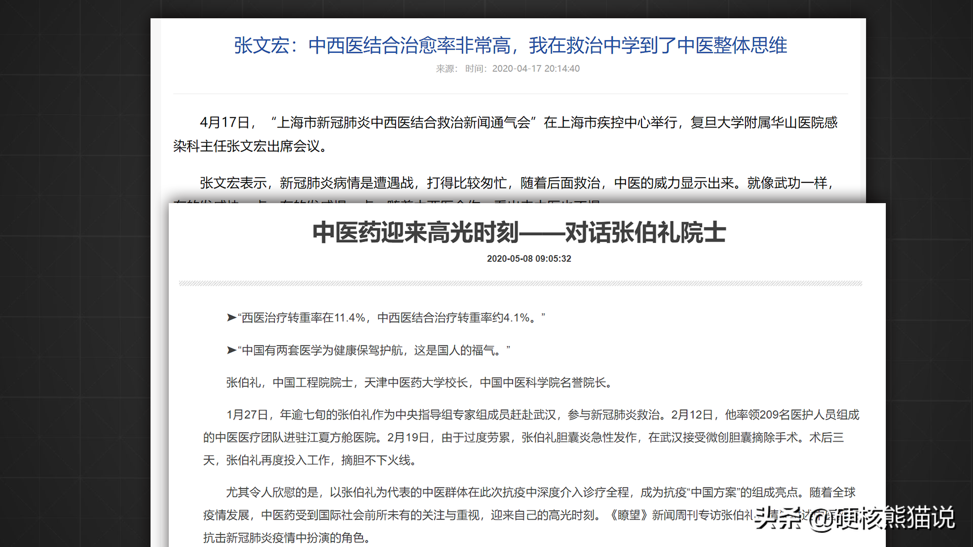 在接下来的时间里,张伯礼、张文宏等医学专家也陆续发现,在新冠治疗中,中医的效果非常好,尤其和西医结合的时候,预防重症以及治愈都率非常高。
