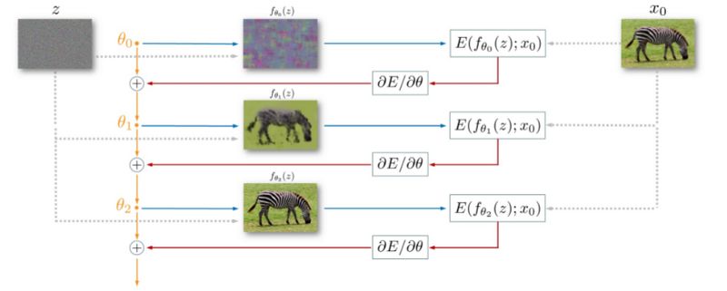 3.最后,当我们找到最佳θ时,我们可以通过将固定输入z向前传递到具有参数θ的网络来获得最佳图像。