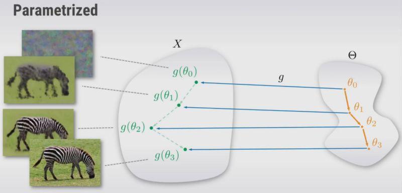 另一种方法是构造函数g,其用随机θ初始化,来自不同空间的输出可以被映射到图像x并使用梯度下降来更新θ,直到它在某个点收敛。 因此,我们可以优化θ,而不是优化图像空间。