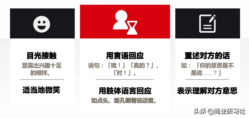 准备好再去听、找出与你兴趣相关的信息、心胸开阔,不带偏见、听出重点、批判性倾听、协助说话者。