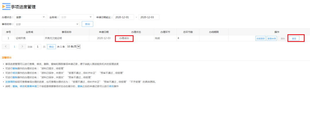 纳税人成功提交申请后,返回首页并选择【我要查询】—【办税进度及结果信息查询(新)】进入“事项进度管理”界面,即可查询办理进度。