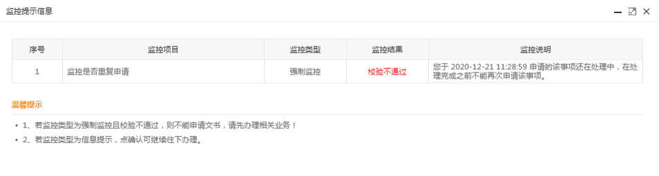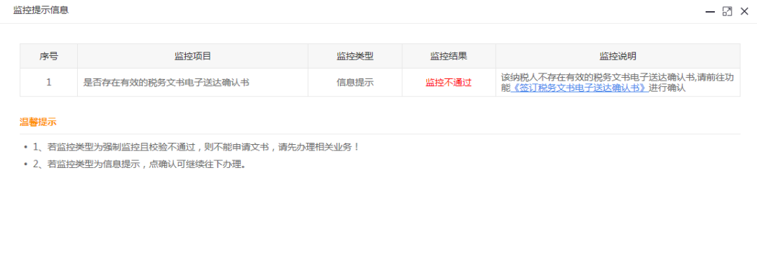 2.若纳税人不存在有效的税务文书电子送达确认书,系统将会出现监控提示信息。