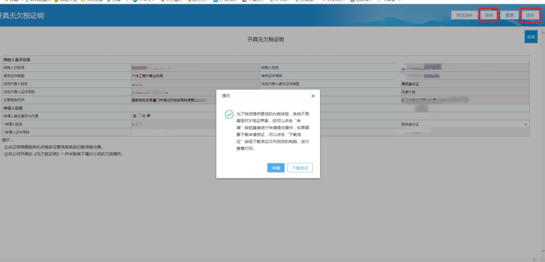系统将自动带出企业基础信息,确认信息无误后,点击界面右上角【保存】和【提交】后,将出现“下载凭证”的提示框,点击【申请】按钮直接进行申请提交操作,如需下载申请凭证,可点击【下载凭证】按钮下载后进行查看打印。