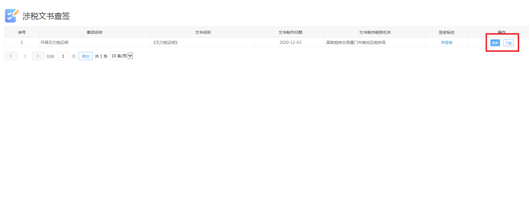 纳税人可点击右侧【查签】进入“涉税文书查签”模块,点击右侧【签收】即可。若需打印纸质无欠税证明,则点击【下载】并打印即可。