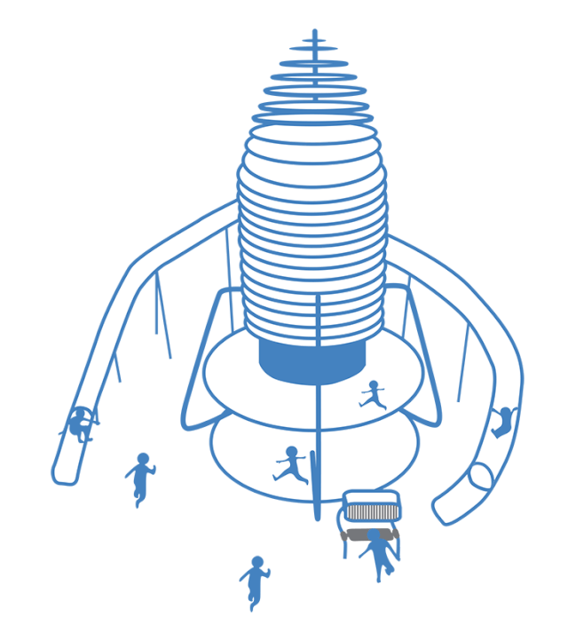 飞船内部划分两层空间,可以由下面的螺旋爬网直接到达2层空间,由滑筒由上滑下,在保障其安全性的同时创造或者鼓励孩子们去探索和冒险。